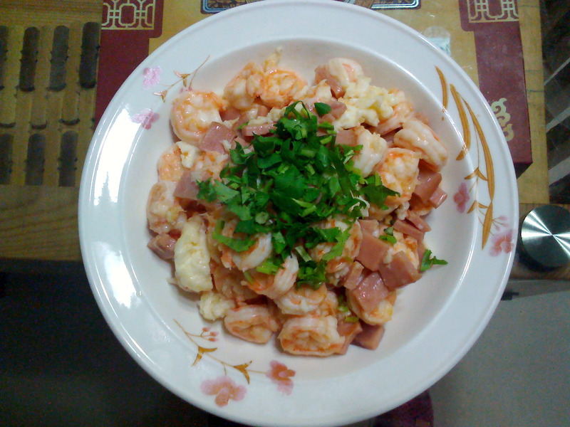 及以下步骤:蛋清中加入生粉,盐调成稀糊. 炒锅烧热加入猪油. 猪油化后倒入蛋清糊翻炒. 蛋糊变白加入火煺丁翻炒. 翻炒火煺几下后加虾仁. 翻炒虾仁变色后装盘. 装盘后放上一点香菜叶完成. 翻炒火煺几下后加虾仁. 翻炒虾仁变色后装盘. 装盘后放上一点香菜叶完成.