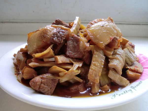 5、起油锅,放入姜片爆一下,然后倒入肉翻炒一下,然后倒入料酒翻炒,再加入茶笋,加盐、老抽、糖及适量水,水沸后改中小火保持微沸状态煮至肉酥软即可。