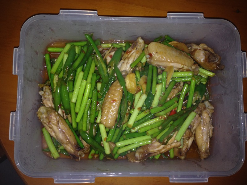 及以下步骤:大功告成了 装入饭盒 明天就有营养午餐了 蒜苔 辣椒 洗净切好 放少许盐(这样炒出来的蒜苔比较入味,也容易炒熟) 把指天椒 蒜头 姜切好备用 鸡翅洗净 一分二(为了更入味)放在网子滤干 放入少许油 放放姜片 鸡翅 翻炒 炒到鸡翅皮变成黄色 放入酱油 豆瓣酱 白沙糖 指天椒 蒜头 翻炒 放入腌好的蒜苔和青椒一起炒 大功告成了 装入饭盒 明天就有营养午餐了
