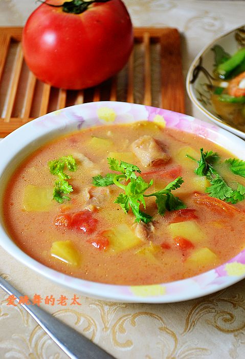当一眼看到大喜大牛肉粉时,我就想到了要用这个做做杂蔬浓汤。 冰箱里有只鸡腿,配个土豆与番茄,炖的时间长些,味道一定很浓郁! 果不其然~~当我把这盆浓汤端上来时,老公问;是罗宋汤吗? 呵呵~~~味道决不输罗宋汤!