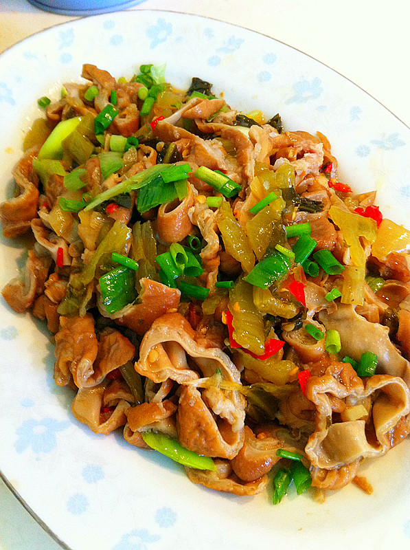 雪菜爆大肠,街边夜排档点菜率最高的风味美食小炒。吃着酸辣的猪大肠,喝着冰爽的夜啤酒,那叫淋漓痛快!雪菜或者腌制的芥菜,都是上好的辅料,配上浓郁的特殊气味的大肠,真是绝佳的美食!