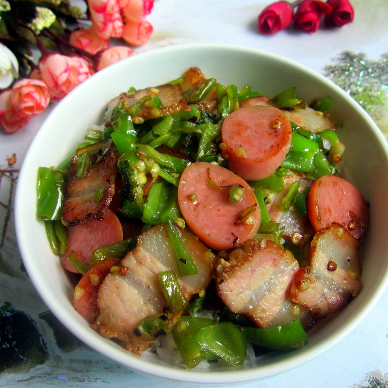用料: 火腿1根,腊肉适量,青椒2个, 盐,油,生抽,鸡精。 方法: 1、取适量的火腿,腊肉切片,青椒切丝, 2、剩饭1碗, 3、青椒放进油锅里炒片刻,加盐 4、加入切好的腊肉片翻炒, 5、调入生抽,炒匀, 6、加入火腿片翻炒,再调入鸡精,放一点点清水, 7、出锅,倒在加好热的剩饭上面。 (剩饭用微波炉加热5分钟。) 8、再次将码好肉的饭放微波炉加热3分钟即成。 这个过程是将炒好的火腿肉片里的汁,更容易容入饭中,更入味,更美味。 所以就叫盖烧饭哦!试试吧,好吃哦!
