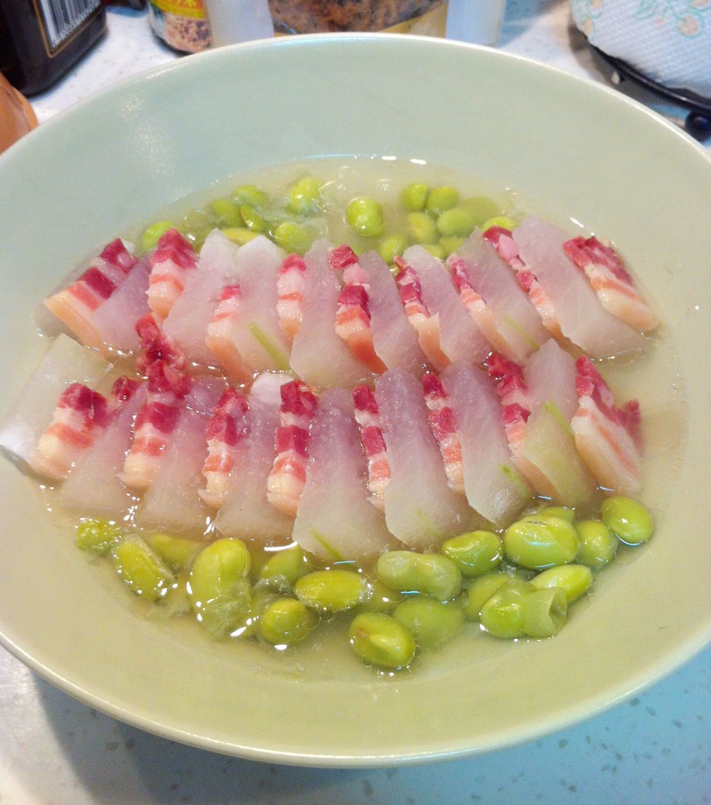 7、一片冬瓜片一片南风肉片,整齐码在深盘里,两边放上毛豆,(可以浇少量高汤,没有也无妨)入蒸锅蒸20分钟,待冬瓜成透明状即可