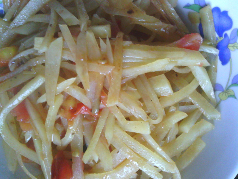 看似道不同的两个菜,以前也从没想过把他们放在一起,可是看着其他朋友这样做了,爱吃土豆的我终于也试了试,这下好了,试出了感情,昨天 晚餐炒了三次这个土豆,而且都说很好吃。