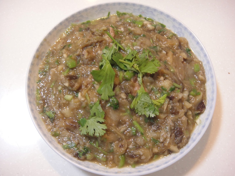 及以下步骤:加入茄子条,煸炒 为避免糊底,要不停翻动。煸炒大约10分钟,茄子蔫巴如图 加入肉片,翻炒至肉片变白。加海鲜酱油再翻炒两下,加清水,大火烧开 在烧开的过程中,这时候削土豆皮,时间利用的刚刚好。切成小块如图,在汤开了之后加入。烧开,盖锅盖,关小火炖,计时开始。 在炖制的过程中,将葱、姜、蒜、尖椒切末,时间也刚好够用。 在炖制过程中,适当翻动,避免糊底。计时15分钟后,开锅盖,用铲子将土豆按压碎如图 关火。加入盐、味精、葱、姜、蒜、香菜、尖椒末 搅拌均匀 出锅装盘,美味成了 ^_^ 出锅装盘,美味成了 ^_^