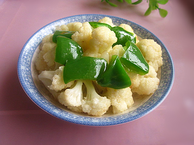 看到超市里里有新鲜的花菜了,那洁白的颜色真漂亮,就买了一个回来,本来想用高汤烩菜的方法来做它,可是中午时又天太热,不想吃油腻的东西啦,就用青椒加了些蚝油来清炒,结果口感也挺棒。真的很好吃耶。