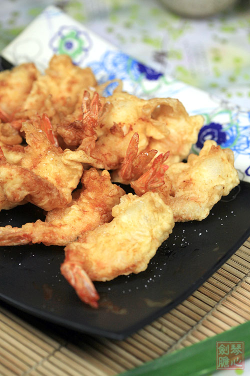 日本餐里把炸虾叫天妇罗,其实中餐也有这样的做法,感觉这个炸虾也不应该叫天妇罗,嘿嘿。粤菜里炸虾或其他东西的粉底有一定的比例,用米粉和面粉混合一起,一般的比例是5:3,比纯粹用面粉好,炸出来的食品即使凉了也能保持爽脆的感觉。我想每个人都有不同的配方,因为我手里就有好几个,每个感觉都不一样,做出来的效果都很好。