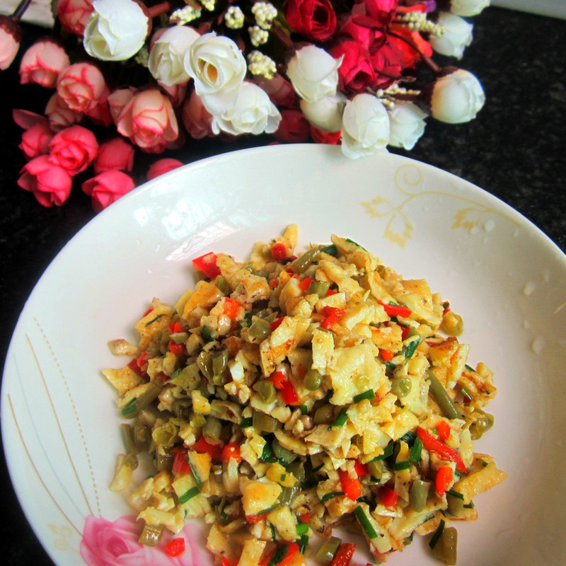 食材: 蛋皮,辣椒,腌豆角,葱末,蒜米。 调料: 精盐,调和油,调味鲜。 方法: 1、煎好的蛋皮切丁,腌豆角切碎,辣椒切丁。 2、先将切好的辣椒,蒜米,腌豆角倒进热油锅里炒香, 3、再放进蛋丁翻炒均匀, 4、加一点点精盐炒匀,放进葱末炒匀。 5、最后调入调味鲜即成。