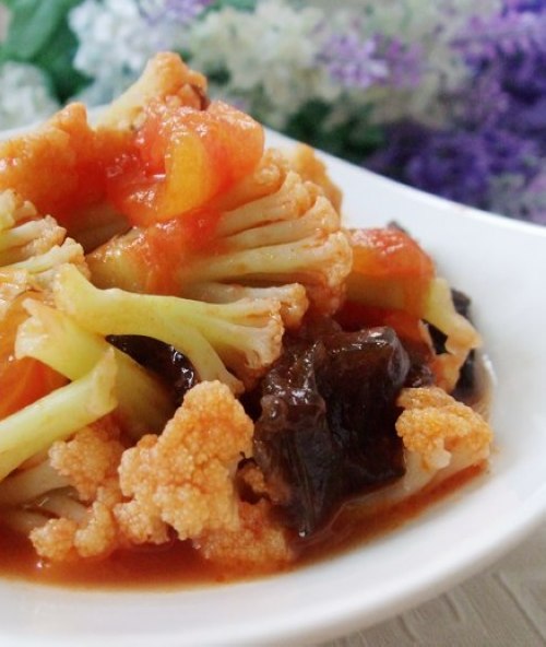 及以下步骤:放入一大勺番茄酱,一勺白糖煸炒片刻。 放入少许盐,拌均匀即可。 花菜用手撕成小朵,放入淡盐水中浸泡10分钟后,用清水洗净备用。 木耳泡发洗净去蒂撕小朵待用。 西红柿切滚刀块。 锅中倒入清水,水沸后放入花菜焯烫二分钟,捞出投入凉水中备用。 锅中倒入适量油,油温7成热放入西红柿块炒至变软。 放入焯水过的花菜、木耳翻炒3分钟。 放入一大勺番茄酱,一勺白糖煸炒片刻。 放入少许盐,拌均匀即可。