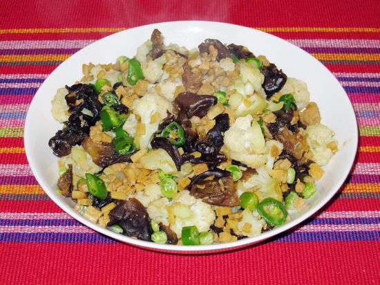 猪肉(400克) / 黑木耳(100克) / 白豆干(350克) / 菜花(400克) / 鸡腿菇(200克) / 鲜豌豆(100克)