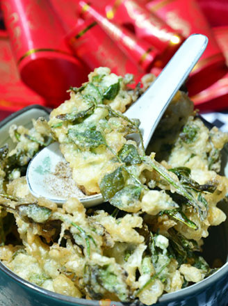 及以下步骤:面粉中打入一个鸡蛋 加入少许盐 面粉中打入一个鸡蛋 加入少许盐 面粉中打入一个鸡蛋 加入少许盐 加入适当的水后滴和几滴香油和匀 将洗净的花椒芽裹入面糊 锅中放油,烧至八成热后下花椒芽 炸制两面金黄即可