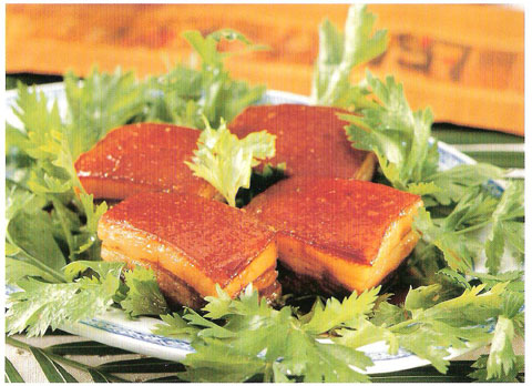 及以下步骤:将肉块放入锅里,加葱、料酒、酱油,用慢火烧煮,使肉块上色,然后调入白糖和适量开水(没过肉面),先用大火烧半小时,再改为小火上焖1个半小时左右。 将猪肉切成方块,放入开水锅里焯5分钟,出去血污,捞出用清水洗净。 将肉块放入锅里,加葱、料酒、酱油,用慢火烧煮,使肉块上色,然后调入白糖和适量开水(没过肉面),先用大火烧半小时,再改为小火上焖1个半小时左右。 将猪肉切成方块,放入开水锅里焯5分钟,出去血污,捞出用清水洗净。 将肉块放入锅里,加葱、料酒、酱油,用慢火烧煮,使肉块上色,然后调入白糖和适量开水(没过肉面),先用大火烧半小时,再改为小火上焖1个半小时左右。 将猪肉切成方块,放入开水锅里焯5分钟,出去血污,捞出用清水洗净。 将肉块放入锅里,加葱、料酒、酱油,用慢火烧煮,使肉块上色,然后调入白糖和适量开水(没过肉面),先用大火烧半小时,再改为小火上焖1个半小时左右。 此时肉块已皮酥肉烂、汤汁稠浓,用勺子撇去汤面油腻,连汤带肉盛出,装入瓷罐待用。 食用前用桑皮将瓷罐口密封,放入蒸笼内大火蒸15分钟,蒸透即成。 将泽洗干净的青菜用开水烫一下,拌以橄榄油,放在盘中作底,将肉块放在上面,浇上肉汁即可。