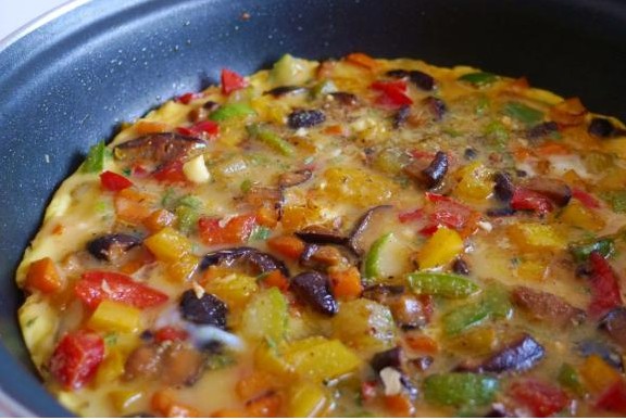及以下步骤:煎至蛋液表面半凝固时,撒入1勺奶酪粉 关火,盖上盖子焖2分钟,至蛋液基本凝固即可。 香菇泡发,各种蔬菜洗净,切小丁 鸡蛋中加入白胡椒、香葱丝,盐,打散。 蛋液中加入50ml淡奶油,搅拌均匀。 橄榄油烧热,加入所有蔬菜丁,大火炒软(3-5分钟) 倒入蛋液 转小火煎。 煎至蛋液表面半凝固时,撒入1勺奶酪粉 关火,盖上盖子焖2分钟,至蛋液基本凝固即可。