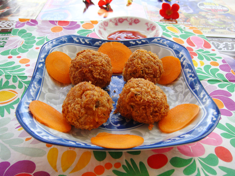 7、做好的球在面包糠里滚一下,全部沾到为止。