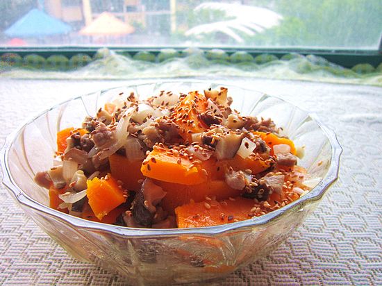 及以下步骤:加香菇和瘦肉丁翻炒 加香菇和瘦肉丁翻炒 加点红酒盐,醋胡椒粉翻炒均匀出锅 把烫好的南瓜装在大碗里,撒上炒好的香菇肉末, 放在微波炉里,高火加热3分钟就好了,最后装盘撒上熟芝麻就行了。 加香菇和瘦肉丁翻炒 加香菇和瘦肉丁翻炒 加点红酒盐,醋胡椒粉翻炒均匀出锅 把烫好的南瓜装在大碗里,撒上炒好的香菇肉末, 放在微波炉里,高火加热3分钟就好了,最后装盘撒上熟芝麻就行了。