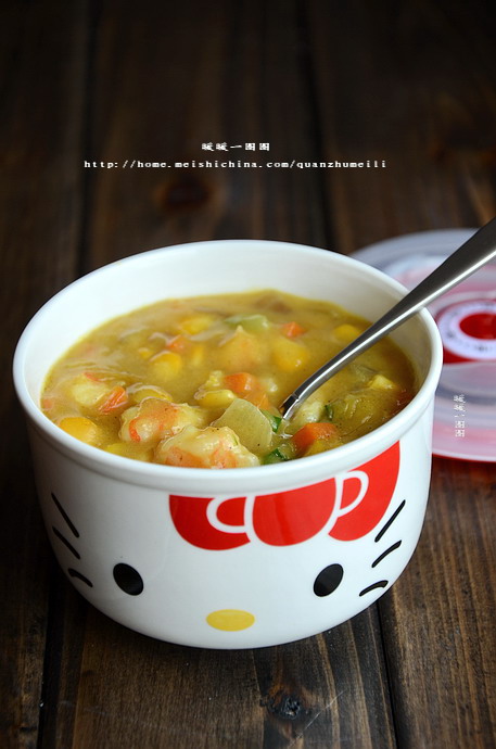 及以下步骤:炒锅中倒油,虾仁滑散,盛出。 放入胡萝卜和洋葱,翻炒至洋葱透明。 放入玉米粒翻炒,加水煮开后继续煮约2分钟。 放入3块咖喱块,小火慢慢搅拌至咖喱块融化。 淋一点椰浆拌匀,放入虾仁和黄瓜。 转小火煮5分钟左右,至咖喱汁稍微浓稠即可。 放入玉米粒翻炒,加水煮开后继续煮约2分钟。 放入3块咖喱块,小火慢慢搅拌至咖喱块融化。 淋一点椰浆拌匀,放入虾仁和黄瓜。 转小火煮5分钟左右,至咖喱汁稍微浓稠即可。