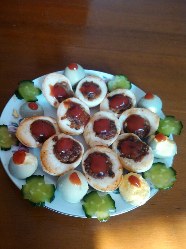 1,把鸡蛋煮熟,切半 2,拌好肉馅并将熟鸡蛋黄挖出放入肉馅中搅拌 3,将肉馅填入煮熟的蛋清中 4,下油锅煎,煎至肉馅鼓出成熟,蛋清表面金黄,即可出锅 5,肉馅上用番茄酱点缀,用切好的黄瓜点缀即可!!很香哦!!