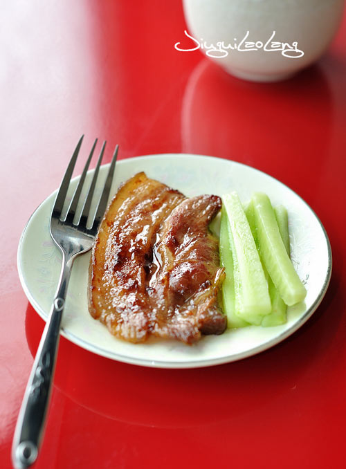 有了烤箱就像是有了个大大的玩具,没事就琢磨着让她干活,呵呵。 今年可能是我吃五花肉最多的一年,以前从没有发现五花肉是如此的美味、如此的可爱。肥瘦相间,最好是五层的咋做都香,后果是我的体重也像火箭噌噌的往上窜,要是朝鲜的火箭多好啊,涨着涨着就掉下来了,呵呵。 用烤箱尝试过烤全鸡,不是成功,是比较的成功,有了这次的成功我的胆子也就大了。今天做次烤肉试试,正好打发掉那开了封的烤肉酱。 烤肉我喜欢那种薄薄的肉片,料汁浓浓的,吃到嘴里即化的是最最理想的了。但问题是如何把五花肉切成薄片,生切是有难度,冷冻下也许可以。我还是喜欢焯水后的五花肉,拿在手里结结实实的比较听话,用快刀可以很容易的切成薄片。 这次烤肉我做了两种口味的,一种是没有抹烤肉酱的原味烤肉,另一种就是用了烤肉酱的。事实证明,这两种风味的烤肉我儿子都喜欢。人家喜欢把馒头掰开了,夹上烤肉大口大口的吃。