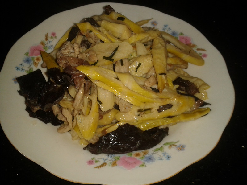 及以下步骤:笋,化开。 笋洗净切片,木耳择洗干净。备用。肉丝先腌制一下,炒熟。(由于我前一天肉丝买多了,炒好放冰箱的,所以今天就不用炒了。) 笋,化开。 笋洗净切片,木耳择洗干净。备用。肉丝先腌制一下,炒熟。(由于我前一天肉丝买多了,炒好放冰箱的,所以今天就不用炒了。) 笋,化开。 笋洗净切片,木耳择洗干净。备用。肉丝先腌制一下,炒熟。(由于我前一天肉丝买多了,炒好放冰箱的,所以今天就不用炒了。) 笋,化开。 笋洗净切片,木耳择洗干净。备用。肉丝先腌制一下,炒熟。(由于我前一天肉丝买多了,炒好放冰箱的,所以今天就不用炒了。) 锅里放油烧至三分热,放入葱末蒜泥爆香锅。 放入所有材料一起爆炒,少许加一点点水。放入盐、味精、椒盐粉调味。考究的可以稍微勾个薄芡。起锅装盘。