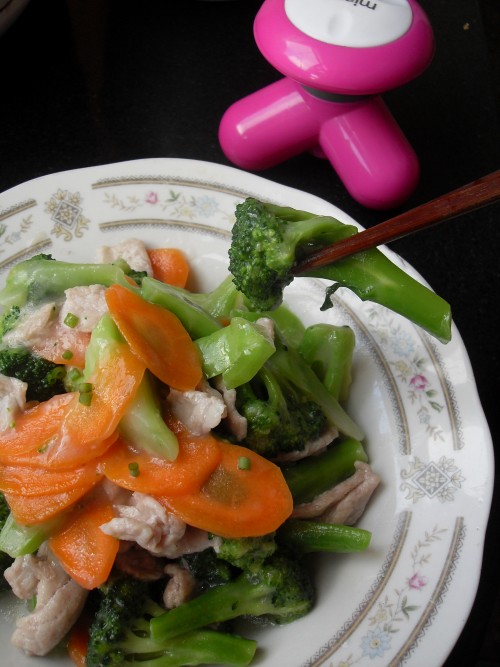 西兰花(一棵) / 胡萝卜(半根) / 肉片(100g)