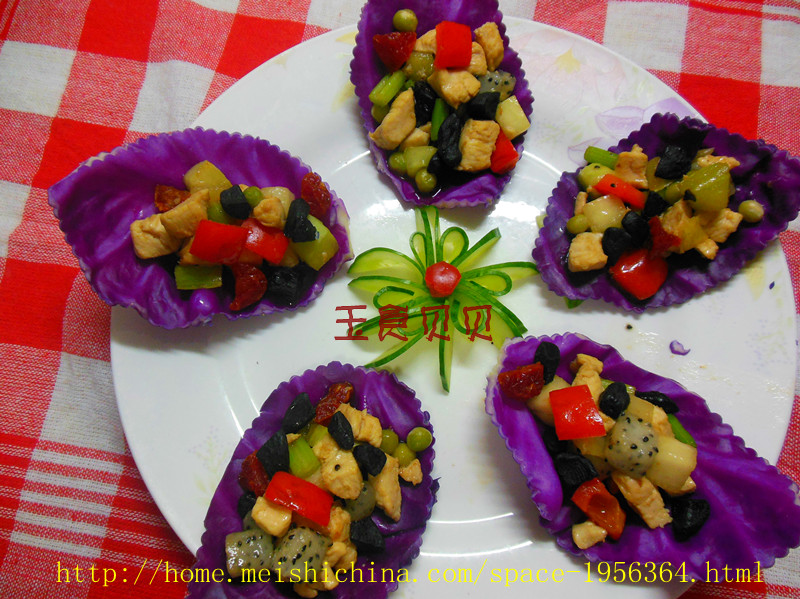 2、淀粉、盐,鸡精适量,紫甘蓝半个(做盏用)。
