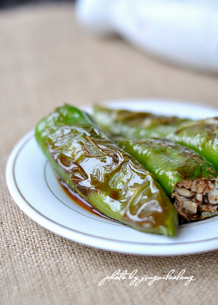 及以下步骤:用料酒,酱油,精盐,白糖调汁备用。 把塞有肉馅的青椒放入热锅里,小火煎至。 煎至表皮起糊斑即可。 倒入调好的料汁,盖锅盖小火炖制至熟。 青尖椒洗净去蒂,去籽。 把调好的肉馅塞入青椒。 用料酒,酱油,精盐,白糖调汁备用。 把塞有肉馅的青椒放入热锅里,小火煎至。 煎至表皮起糊斑即可。 倒入调好的料汁,盖锅盖小火炖制至熟。
