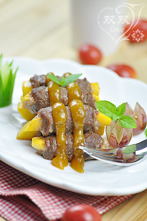 及以下步骤:牛肉平铺,将芒果条放上,卷起。 将肉向中间聚拢,露出果肉。 烤盘预热,220度,铺锡纸,将牛肉卷放入,烤15分钟左右。 将剩余的芒果丁切碎。放入锅内,放少许清水,少许白糖。(我放了生抽,颜色过重,省略吧) 将剩余的芒果丁切碎。放入锅内,放少许清水,少许白糖。(我放了生抽,颜色过重,省略吧) 熬煮至粘稠。 熬煮至粘稠。 放入料理机中搅打成茸。 装入裱花袋或则是保鲜袋中,挤在牛肉卷上即可。 装入裱花袋或则是保鲜袋中,挤在牛肉卷上即可。