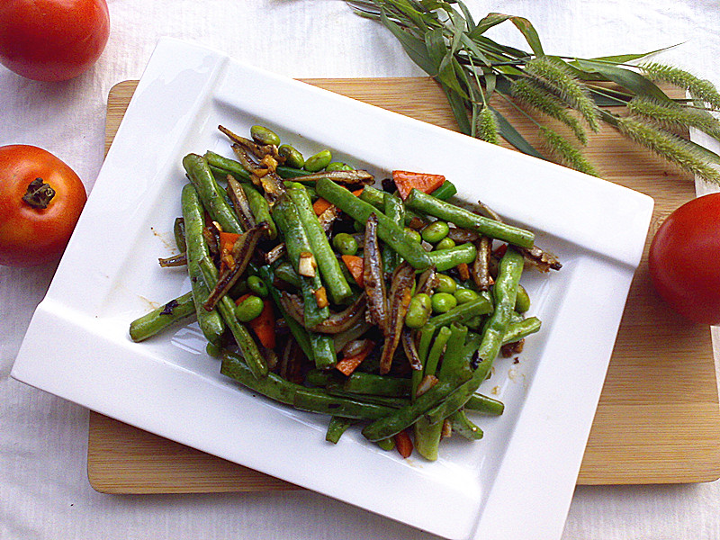 及以下步骤:下所有调味料 加入鱼干、葱段、红萝卜片、熟鲜黄豆翻炒均匀,上碟 我喜欢吃辣的,本想用辣椒的,会更香的,想想还是算了,还是迁就一下家里人吧 下清水在锅内,烧沸,焯熟四季豆,捞 起待用(鲜黄豆用同法焯熟) 烧热锅,下油烧热,再下鱼干炒至干香,盛起待用 另烧热油锅,下豆鼓、蒜粒、姜粒、爆香 投下焯熟的四季豆煸炒 下所有调味料 加入鱼干、葱段、红萝卜片、熟鲜黄豆翻炒均匀,上碟 我喜欢吃辣的,本想用辣椒的,会更香的,想想还是算了,还是迁就一下家里人吧