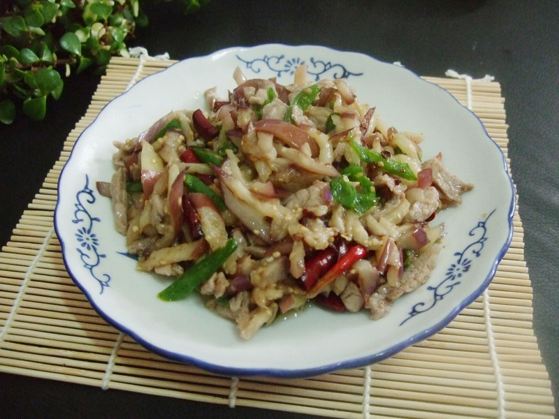 及以下步骤:等茄子炒到变软时把茄子捞一边用剩余的油煸炒肉丝,肉丝变色再和茄子一起翻炒。 加少许鸡精,装盘即可。 准备材料。 茄子,青椒切丝,瘦肉也切丝用盐巴淀粉少许酱油腌制一会。 起油锅放入花椒炸香便把花椒捞出。(记得油要多一点,因为茄子会吸油) 再放入干辣椒和蒜爆香。 加入青椒煸炒。 再放入茄子炒。茄子稍微变色加入盐巴。 等茄子炒到变软时把茄子捞一边用剩余的油煸炒肉丝,肉丝变色再和茄子一起翻炒。 加少许鸡精,装盘即可。