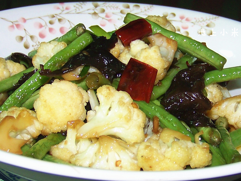 及以下步骤:成品图 原料图 长豆角摘成段,花菜摘小朵,木耳泡发摘去根,撕小朵,干辣椒剪成圈,小葱洗净切段,大蒜剁末 原料图 长豆角摘成段,花菜摘小朵,木耳泡发摘去根,撕小朵,干辣椒剪成圈,小葱洗净切段,大蒜剁末 锅内坐油,先小火把蒜末和干辣椒炒香 放入长豆角和花菜翻炒三到四分钟(因火候和所用炊具的不同,时间由各家自行掌握) 长豆角和花菜炒至8分熟时,放入木耳继续翻炒至熟 调入生抽、盐和鸡精,最后放入葱段再炒至小葱断生即可出锅 成品图