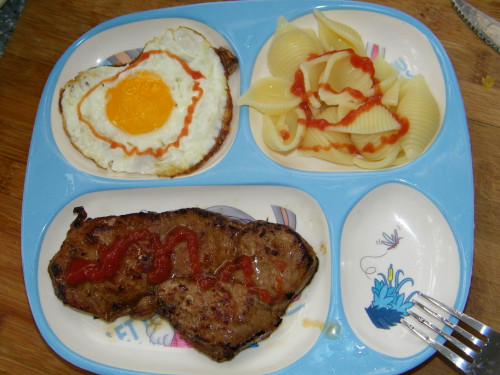 鸡蛋(适量) / 牛排(适量) / 螺丝面(适量)
