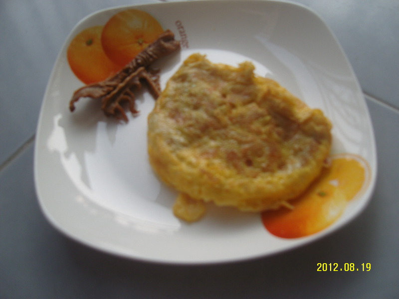 4、热油,煎蛋~(我煎的有一点失败~要记得留一点蛋液等会儿用~)