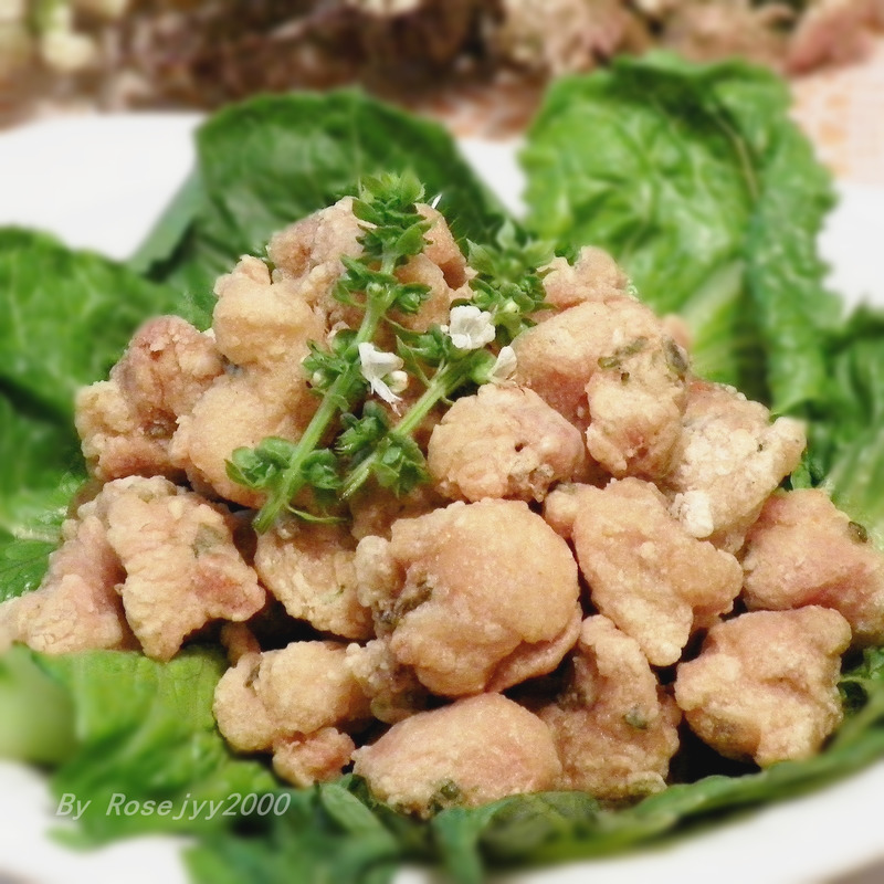 及以下步骤:鸡肉切成块,约女士麻将大小,大小可由自己定,但不要过大块,难熟; 摘取萝勒叶和迷迭香,洗净,用毛巾吸干水,剁碎; 鸡肉切成块,约女士麻将大小,大小可由自己定,但不要过大块,难熟; 摘取萝勒叶和迷迭香,洗净,用毛巾吸干水,剁碎; 鸡肉切成块,约女士麻将大小,大小可由自己定,但不要过大块,难熟; 摘取萝勒叶和迷迭香,洗净,用毛巾吸干水,剁碎; 鸡肉切成块,约女士麻将大小,大小可由自己定,但不要过大块,难熟; 用一大盘,放鸡块和萝勒和迷迭香碎,加蒜盐2/3小匙、料酒1小匙、糖1/4小匙、胡椒粉1/4小匙,用手抓腌至手感很粘,静置30分钟; 再加玉米淀粉,用量至每块鸡块能分离不互相粘着; 开锅放油,中小火,炸至鸡块浅黄色,捞起,再加中大火,油再升温,返炸至金黄色。