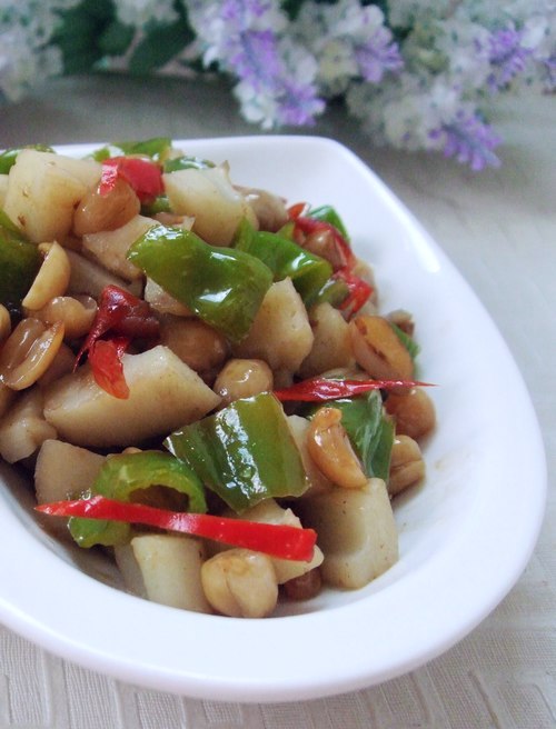 及以下步骤:放藕丁、青椒翻炒2分钟 放入糖、醋、盐炒片刻。 倒入花生米拌均匀即可。 青椒去籽切小片。 蒜切碎,辣椒切小段。 冷油冷锅放入花生米,小火慢慢炸香,炸熟,盛出。 锅中留适量底油,5成热时放入辣椒,蒜爆香 放藕丁、青椒翻炒2分钟 放入糖、醋、盐炒片刻。 倒入花生米拌均匀即可。
