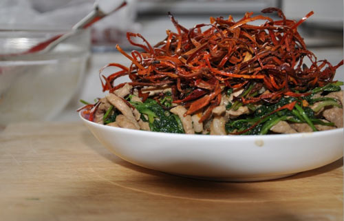 及以下步骤:下入肉丝 爆炒至肉丝变白 下入香菜 翻炒几下,装盘 重新起锅,小量的油,烧至5分热。 下入辣椒丝,不停翻炒。至橘红色。关火。 趁热将辣椒丝和油一起倒在刚才炒好的肉丝上,让辣椒油的香味和肉丝混合在一起。 重新起锅,小量的油,烧至5分热。 下入辣椒丝,不停翻炒。至橘红色。关火。 趁热将辣椒丝和油一起倒在刚才炒好的肉丝上,让辣椒油的香味和肉丝混合在一起。