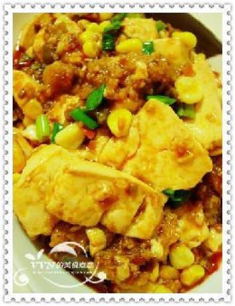 3.用刚才炒牛肉的锅中加入玉米翻炒后加入适量的水或上汤煮滚,用生粉水埋稀芡,下豆腐及调味料。
