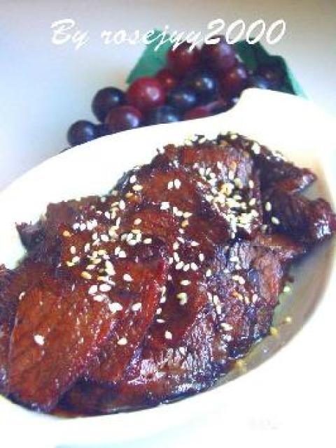 5.起锅放油,放五六茶匙糖粉或冰糖,将糖煮至半焦,放入牛肉片,搅拌几下,再放生抽、老抽和用来卤牛肉水大概半碗,也可多些,在锅里翻匀,收汁,汁剩小半碗吧,将肉盛起(或排好碟),再倒入酱汁,可撒上些芝麻。香到晕啊,赶快乘饭去。