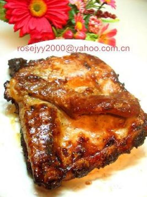 1.最好预先用以上的烧烤酱和生抽(可加少少老抽)和两茶匙白兰地(料酒也行)腌制好,先用锡纸包住用baking功能档烤25--30分钟,再取出来