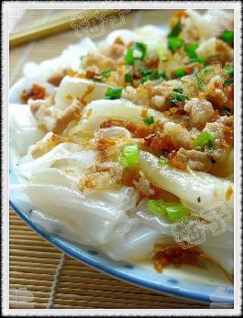 1.陈村粉一斤切短略为摊开在碟上.虾皮和蒜蓉用油炒香后再放调好味的肉末炒一会.然后铺在陈村粉上.再洒点元贝酱(买东西送的没地方用).