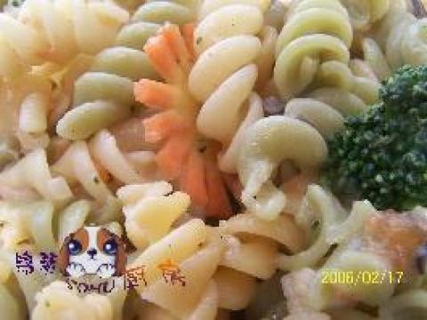 西红柿,洋葱,黄油,三色意面,胡萝卜,西兰花,蘑菇切丝,鲜肉,牛奶,胡椒粉,盐
