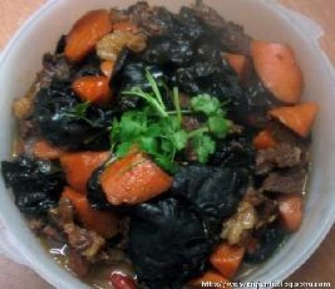 4.炖到牛肉快烂的时候加入泡好的木耳,再炖20-30分钟左右,也可以多炖一会儿。
