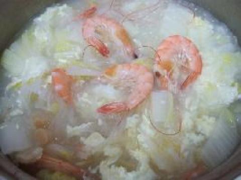 4.最后放入虾煮至变为红色后淋上打散的鸭蛋,再加些盐调味即可。