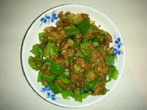 (2)勺内放油烧六七成热。放入茄块炸金黄色,再把青椒块也放入勺内,稍炸倒出沥油。