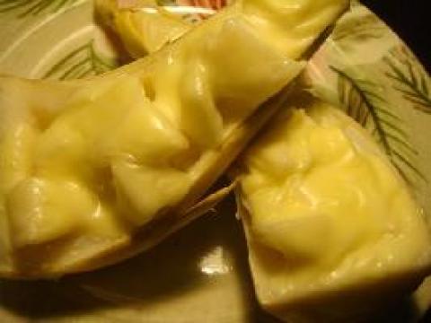 2.取出后从中对切,挖空内笋后切成小块,拌上沙拉酱后再摆回,上放切碎起司或起司片,送入烤箱锔烤即成.
