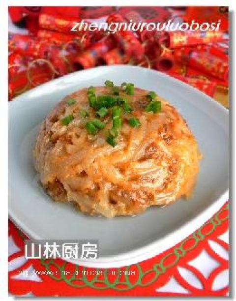7.把蒸好的牛肉萝卜丝倒进一深口碗里,再把深口碗反扣到另一浅口碗,使倒出的牛肉萝卜丝定出似碗的椭圆形(这是本人主意,为了拍摄好看些)。