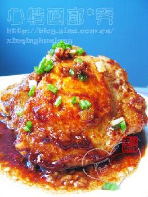 2.浇了一大勺自制蒜肉酱汁焖烧一会儿~