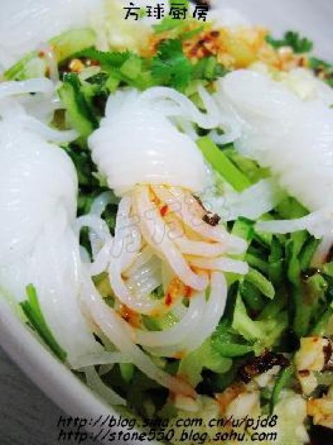 3..黄瓜切丝,铺到盘子里,上面摆上芋结。把醋,盐,辣椒油倒进一个小碗里(红油的做法见于凉拌海带丝 ),搅拌均匀,浇在芋结上,简单美味的红油芋结就成功了!