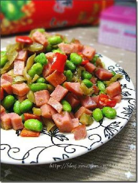 毛豆,火腿肠,老蒋榨菜,红椒,盐,味精