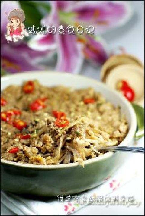 4.五花肉剁成肉末,用a配料腌制十分钟,再入锅中炒香。