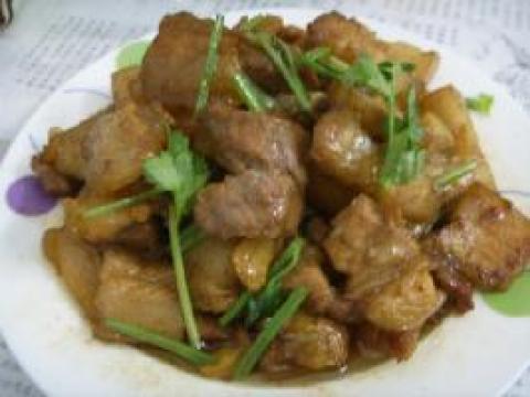 3.油烧热后,把拍散的沙姜放进爆香后,五花肉倒进锅里翻炒,肉变色后把火调小,慢慢煎1-2分钟,可以把肥肉多余的油煎出来一点,吃起来就没那么油腻.然后下盐和酱油,炒匀上色后,溜点水,盖上锅盖焖几分钟,途中要注意开盖翻炒一下,以免粘锅.出锅前放点香菜拌匀就可出锅.